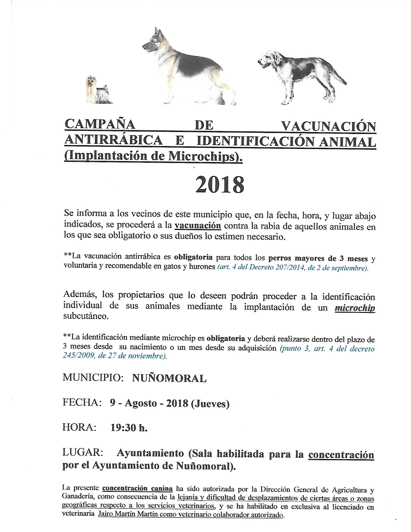 Se informa a los vecinos de este municipio que, en la fecha, hora, y lugar abajo indicados, se procederá a la vacunación contra la rabia de aquellos animales en los que sea obligatorio o sus dueños lo estimen necesario.