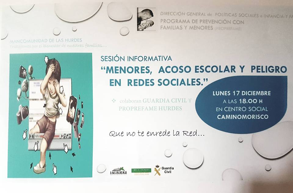SE INFORMA QUE EL PRÓXIMO LUNES 17 DE DICIEMBRE A LAS 18:00H EN EL CENTRO SOCIAL DE CAMINOMORISCO, SE REALIZARÁ UNA CHARLA SOBRE ACOSO ESCOLAR Y PELIGRO EN REDES SOCIALES, LA MISMA ESTÁ ORGANIZADA DESDE EL PROGRAMA DE PREVENCIÓN CON FAMILIA Y MENORES